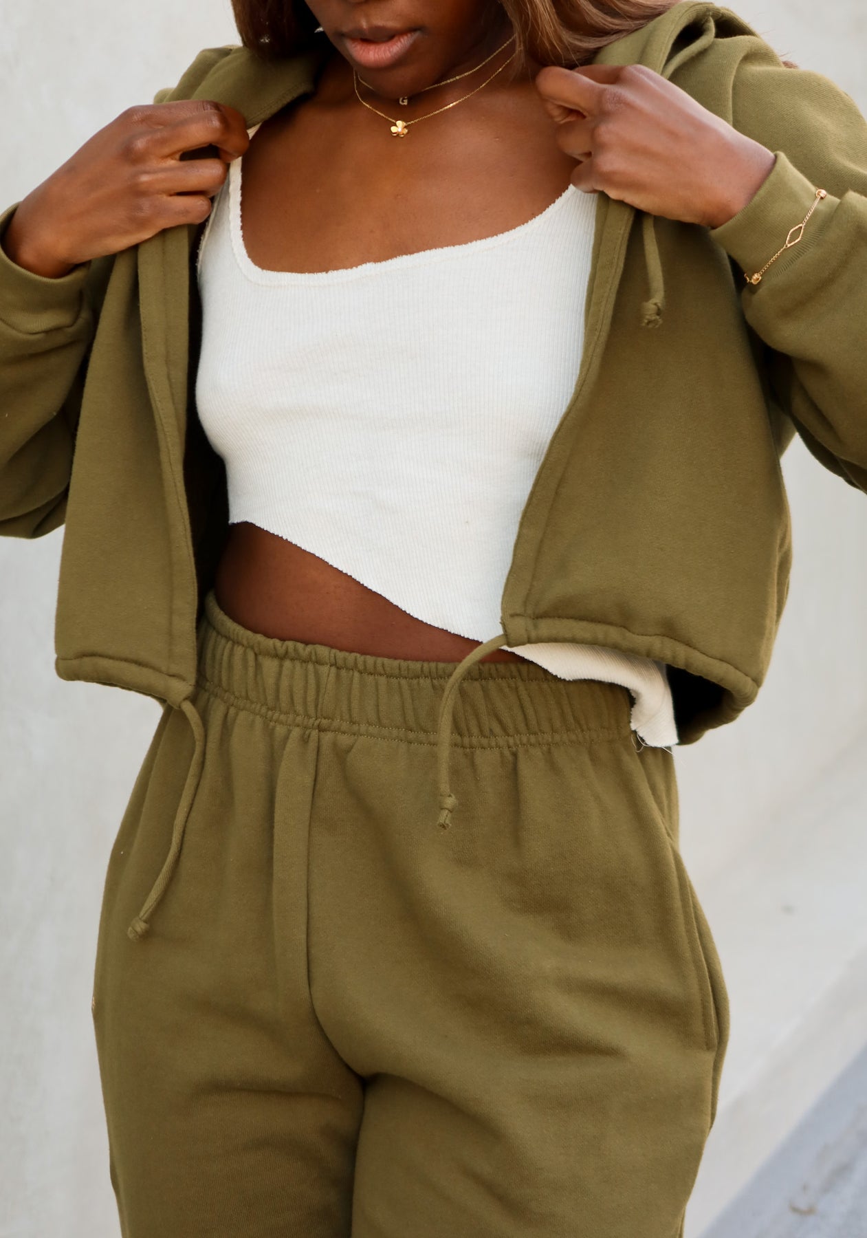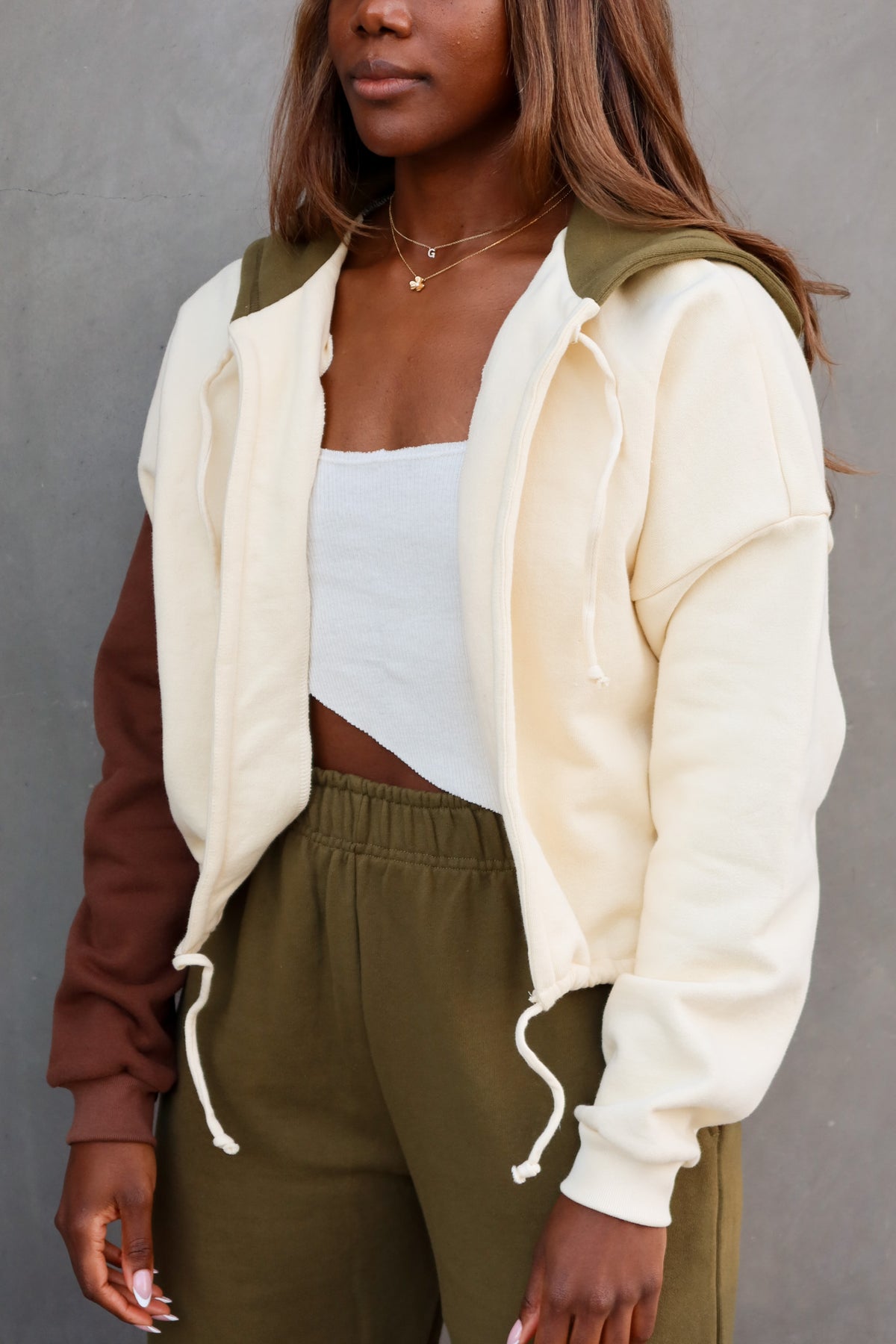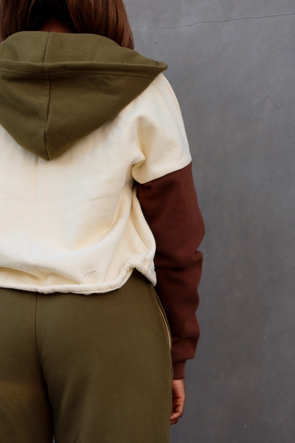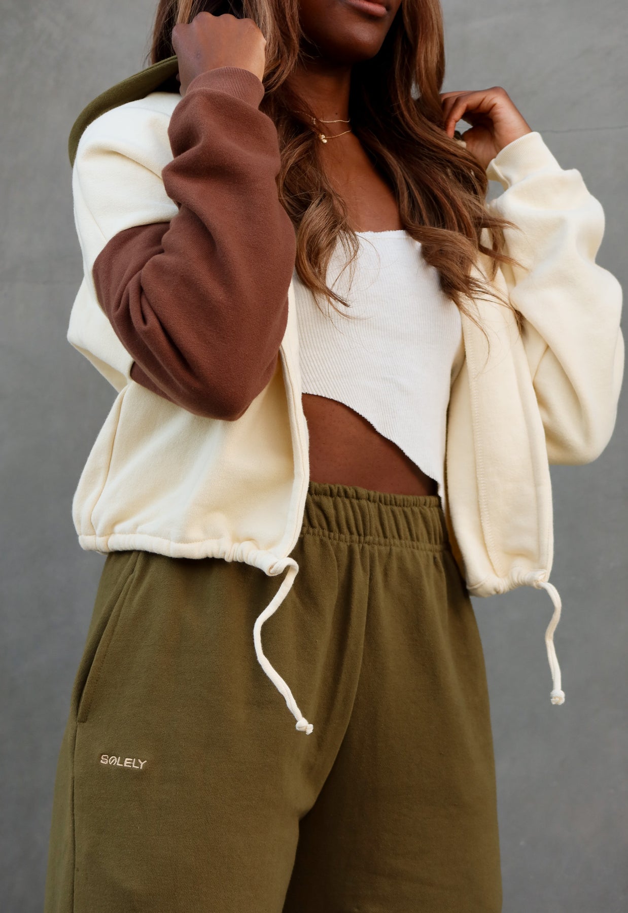 The Harlem Hoodie is our street-luxury must-have: comfort, versatility, and standout design in one statement layer. Its adjustable open-front construction features dual drawcords at the top and hem, giving you the power to wear it loose, tied, or cropped. Available in a bold color-blocked neutral palette or a rich solid Olive for a more understated edge.